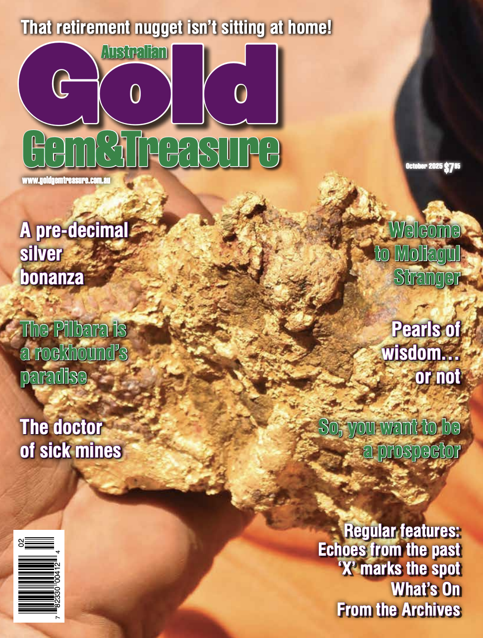If you dig a piece of junk such as a nail or horseshoe, don’t just fill in the hole and move on, but run your detector over the hole again. I once saw a nice fourounce pancake nugget taken from below a horseshoe and I picked up a 20-gram slug from beneath a section of heavy iron plate that was visible to the naked eye. Incidentally, when you find junk, do yourself and others a favour and take it with you when you leave.